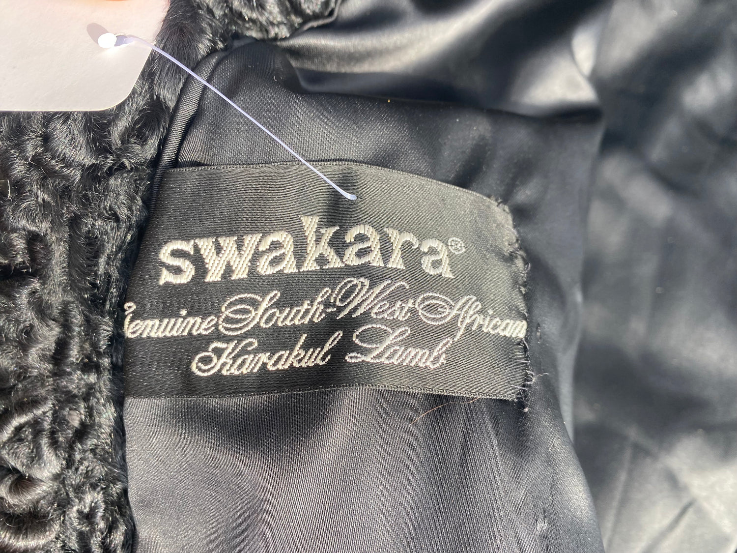 Description: Step into sophistication with this vintage black Karakul lamb fur coat. Made between the 1950s and 1960s, this coat exudes timeless elegance with its long, sleek lines and luxurious texture. The Karakul lamb fur is known for its unique crimped appearance and soft feel, offering a chic and classy look. Featuring big pockets, hook and clasp closures down the front, and a black satin lining, this coat is both functional and stylish. The tag reads "Swakara Genuine South-West African Karakul Lamb," reflecting its exceptional quality. In amazing vintage condition with no noticeable flaws, this coat is a rare find.