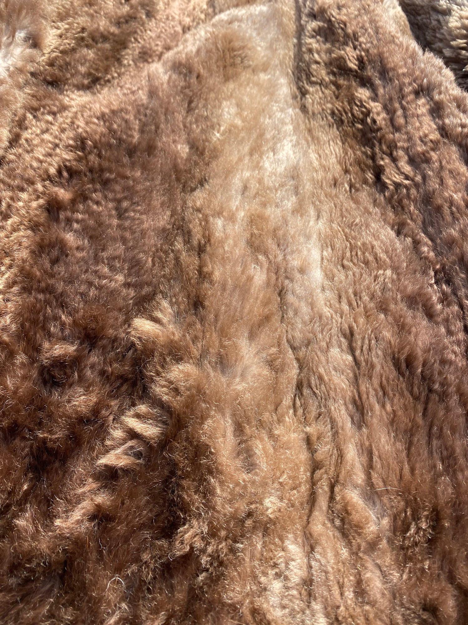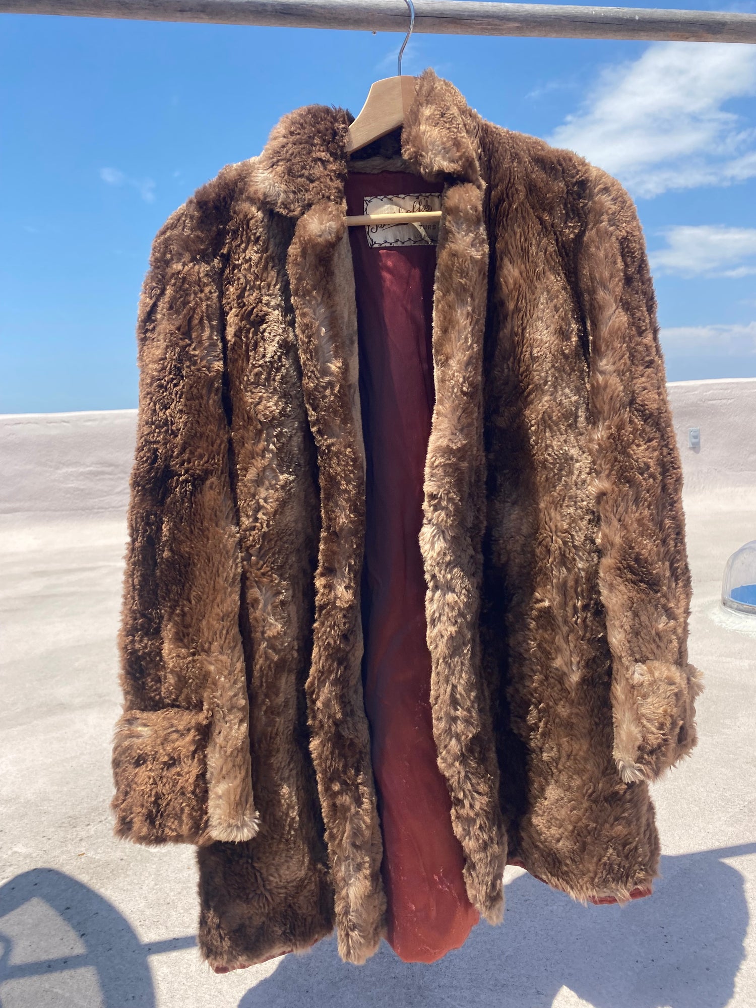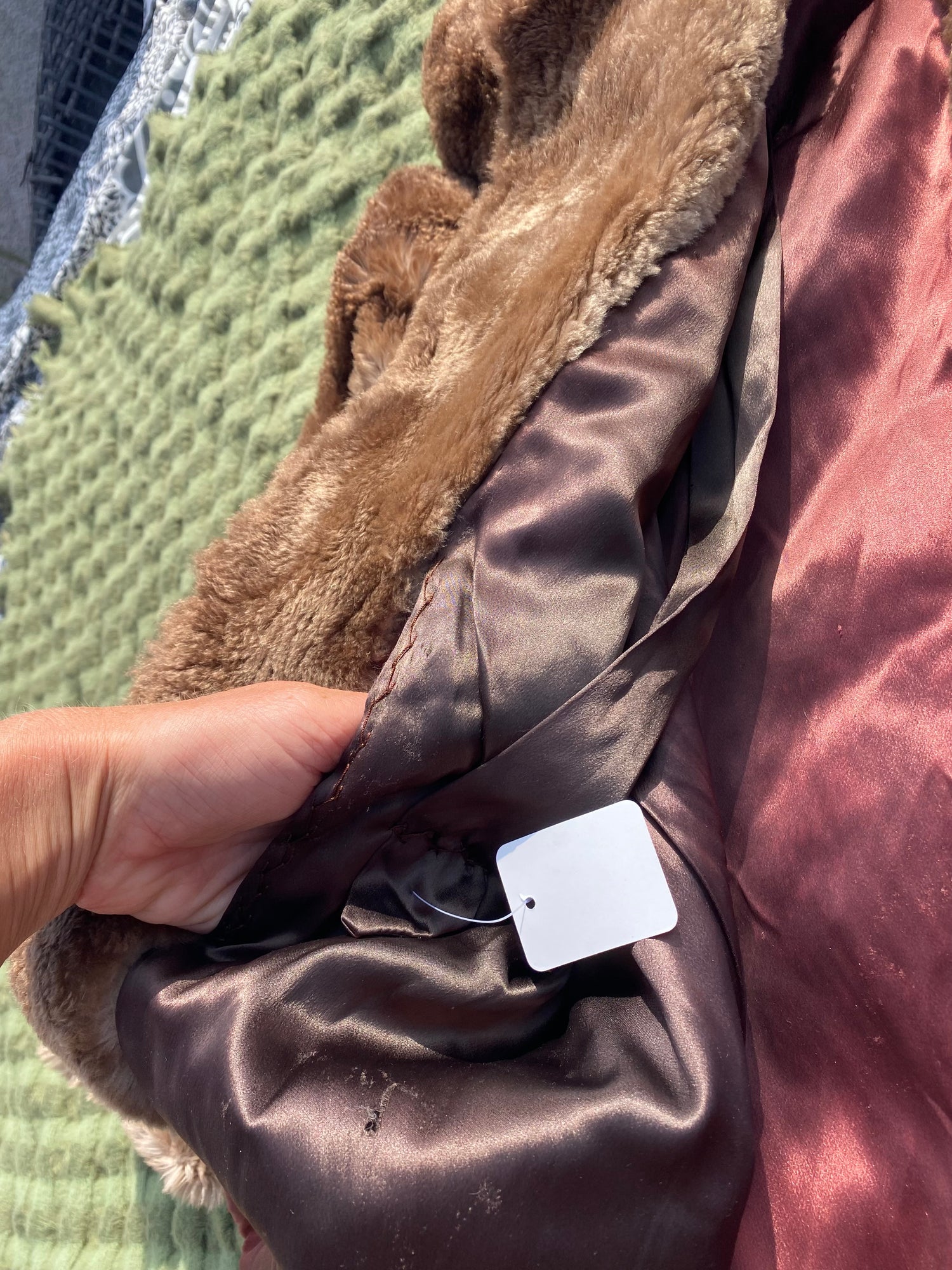 Keywords: vintage sheared beaver fur coat, brown fur coat, luxury vintage fashion, women's large fur coat, men's medium fur coat, thick fur collar, 70's vintage clothing, bohemian fur coat, open-front fur coat, red satin lining, designer vintage coat, unique fur coat, retro fashion, festival outerwear, high-quality vintage, luxury 70's fashion.